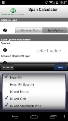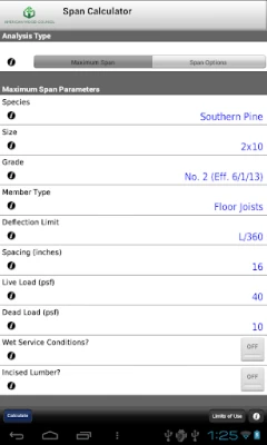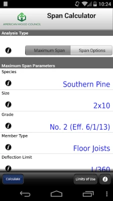 The American Wood Council (AWC) Span Calculator for Wood Joists and Rafters (Span Calc) performs calculations for all species and grades of commercially available softwood and hardwood lumber as found in the 2012 National Design Specification® (NDS®) for Wood Construction Supplement: Design Values for Wood Construction with March 2012 and March 2013 Addenda. Joists and rafter spans for common loading conditions can be determined. A span options calculator allows selection of multiple species and grades for comparison purposes.