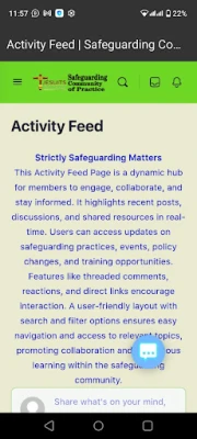 The Safeguarding Community of Practice app connects professionals, individuals, caregivers and organizations dedicated to promoting safety and protection of minors and vulnerable adults in the communities. The app provides a platform for sharing safeguarding knowledge, best practices and resources. The app enables users to collaborate on safeguarding challenges, enhance policies and improve outcomes for minors and vulnerable adults. With outstanding features like discussion forums, resource libraries and real-time updates, the app promotes innovation, learning and support to strengthen safeguarding efforts globally.