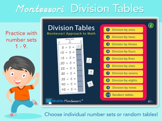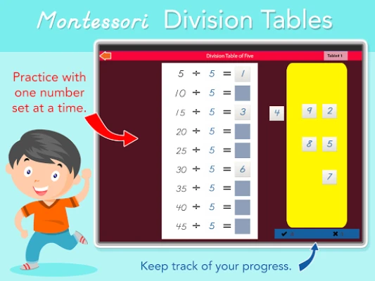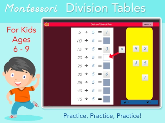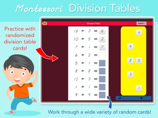 This activity is a time-tested method of reinforcing the basic division tables and is used in Montessori classrooms around the world! This app was co-developed and approved my an AMI certified Montessori teacher with over 40 years experience in the field!